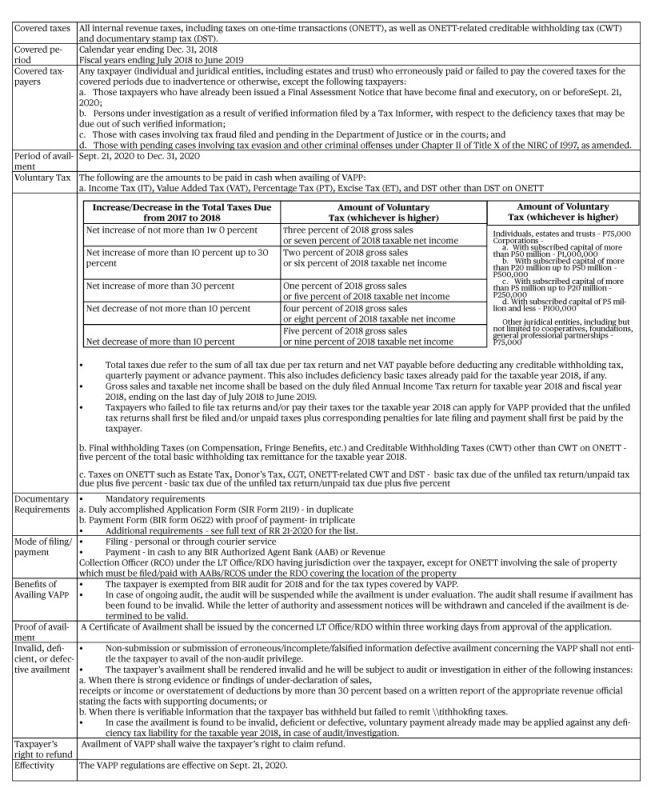 THE Bureau of Internal Revenue (BIR) recently issued Revenue Regulation No. 21-2020 to inform all concerned of the voluntary assessment and payment program (VAPP) of the BIR which can be availed by taxpayers for taxable year 2018 under certain conditions.