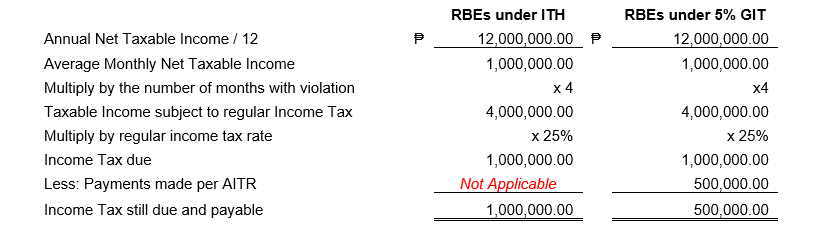 As discussed above, RBEs shall first file and pay based on the incentives that they enjoy. Thereafter, they shall compute the penalties equivalent to the regular income tax of 25% or 20% for the months they were not compliant. In the example above, the RBE enjoying ITH did not pay income tax for the whole year while the RBE enjoying GIT paid the 5% tax of P1.5 million for the entire year.
