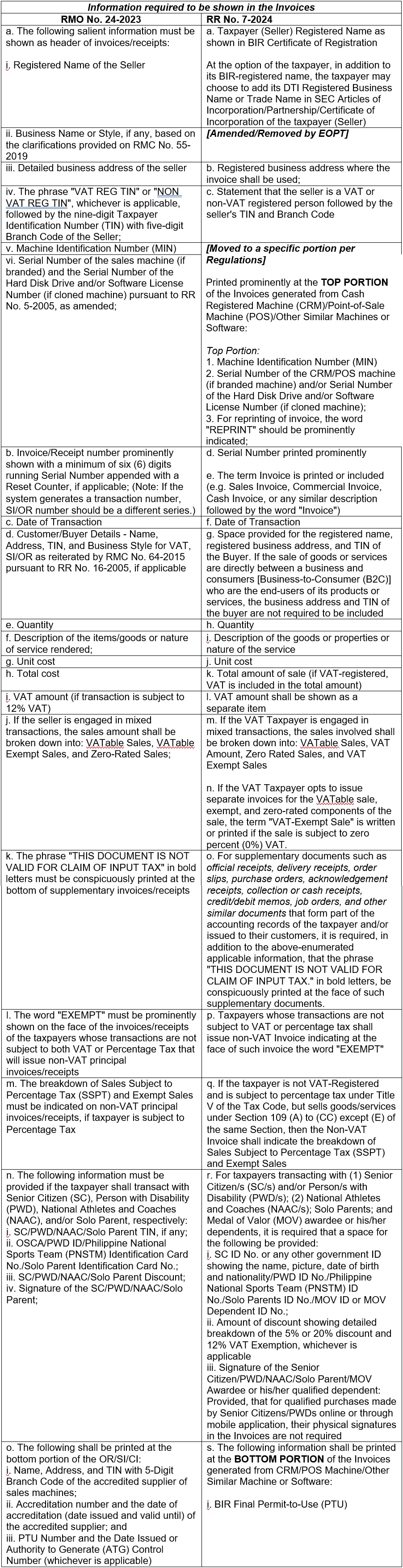 The matrix below shows the required information to be shown in the invoices per RR No. 7-2024 versus RMO No. 24-2023.