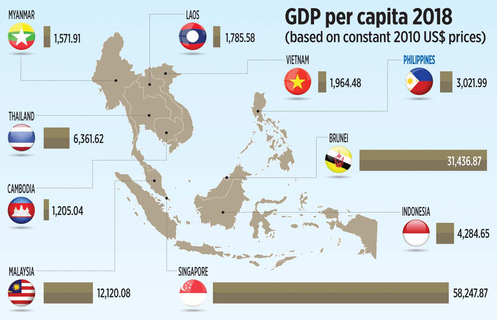 In terms of per capita GDP, the annual growth rate is slower than the total GDP growth, because of the effect of our ever-increasing population, which is currently estimated at 108 million. GDP per capita is a measure of how our economy translates to the economic welfare of the individual Filipino and how we compare with the citizens of other countries. Our per capita GDP in 2018 of $3,095 (from the International Monetary Fund, at current prices) is low and, as such, we are still not a middle-income country. Compared with our Asean neighbors, we have a lower per capita GDP than Singapore, Brunei, Malaysia, Thailand, and Indonesia. Clearly, this comparison portrays a lamentable reversal of position of several decades ago. Our per capita GDP in 2018 surpasses only those of Laos, Vietnam, Cambodia, and Myanmar. In sum, it is not an exaggeration to say that we have lost several decades of economic development potential. This is the reason the current relatively high rate of growth must be sustained and further increased to enable us to catch up with our neighbors.