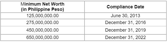 1. The minimum net worth shall comply with the amounts and schedule of compliance provided in the table below: