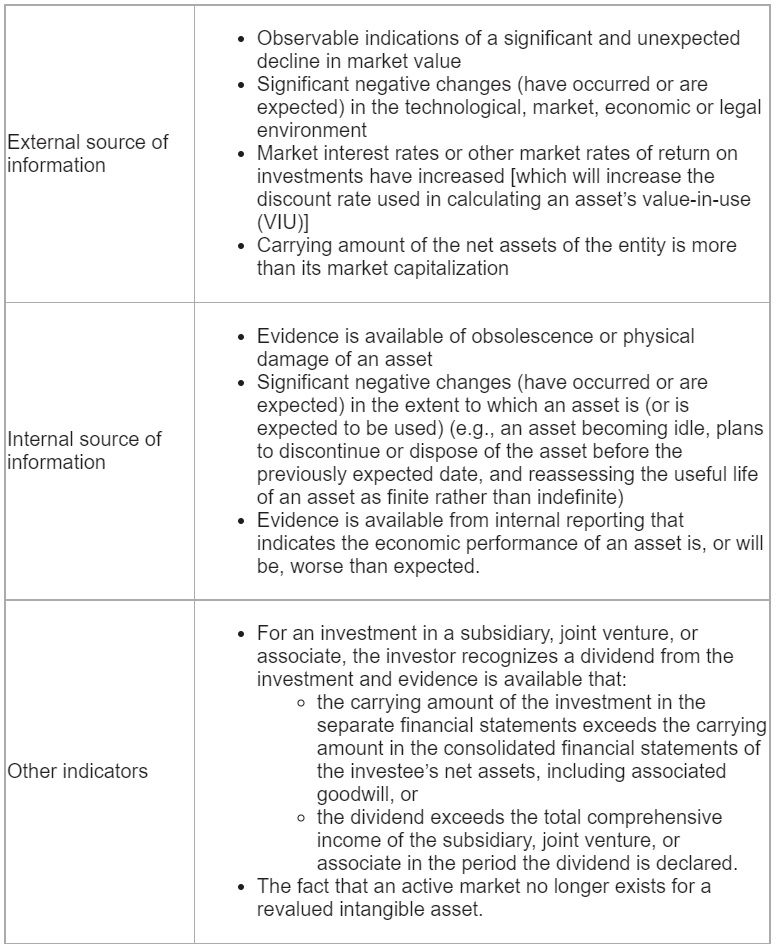 PAS 36 provides a non-exhaustive list of external, internal and other indicators that an entity should consider, as follows: