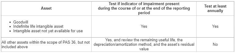 PAS 36 requires an entity to assess at the end of each reporting period whether there is any indication that an asset or CGU may be impaired. This requirement also applies to goodwill, indefinite life intangible assets, and intangible assets not yet ready for use (although, in practice, an indicator review is necessary only at period ends that do not coincide with the annual test). If any such indication exists, the entity should estimate the recoverable amount of the asset or CGU.