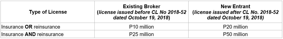 As provided under Section 3 of CL No. 2018-52, licensed insurance and/or reinsurance brokers are required to maintain the following net worth requirements: