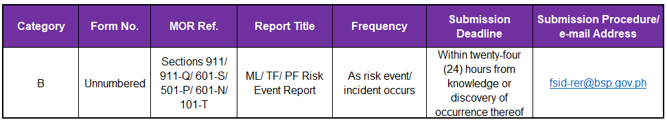Covered persons are required to submit ML/ TF/ PF Risk Event Report to the BSP within twenty-four (24) hours from the date of knowledge or discovery of occurrence (i.e., from the time the event has been known or should have been known by the covered person) of any significant ML/ TF/ PF risk event.