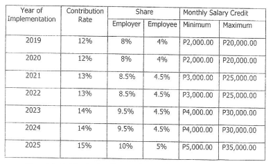 Republic Act (RA) No. 11199 or "An Act rationalizing and expanding the powers and duties of the Social Security Commission to ensure the long-term viability of the Social Security System (SSS) " was approved by President Duterte last February 7, 2019. The law provided for a gradual increase in monthly contributions from the current 11% to 12% effective January 2019. It will further increase by 1% every other year until it reaches 15% in 2025. It also provided the gradual adjustment of the minimum and maximum salary credit.