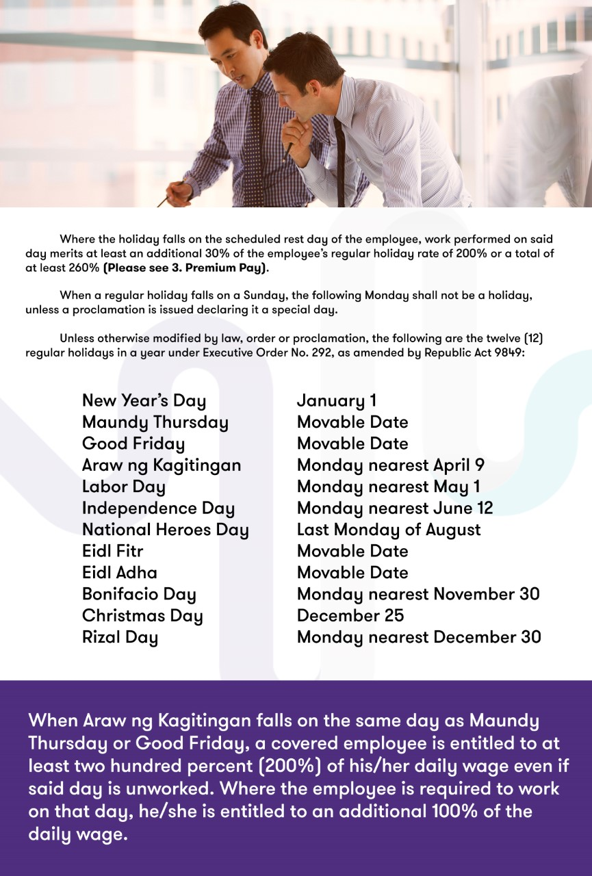 Below shows the regulation on holiday pay from DOLE’s 2019 Handbook on Workers’ Statutory Monetary Benefits: