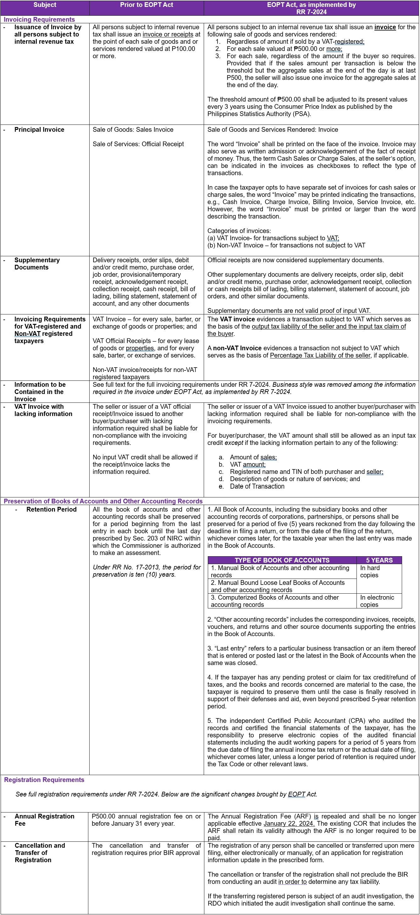 This Tax Alert is issued to inform all concerned on the rules and regulations to implement the amendments on invoicing requirements and registration procedures, pursuant to Republic Act No. 11976, also known as Ease of Paying Taxes (EOPT) Act.