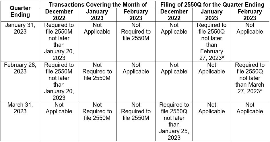The RMC provides that for taxpayers with quarter ending January 31, 2023, they are still required to file BIR Form No. 2550M for the month ending December 31, 2022 and BIR Form No. 2550Q for the quarter ending January 31, 2023.