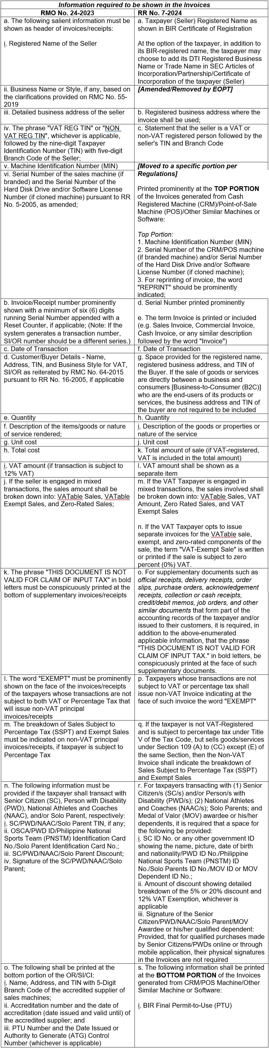 The matrix below shows the required information to be shown in the invoices per RR No. 7-2024 versus RMO No. 24-2023.