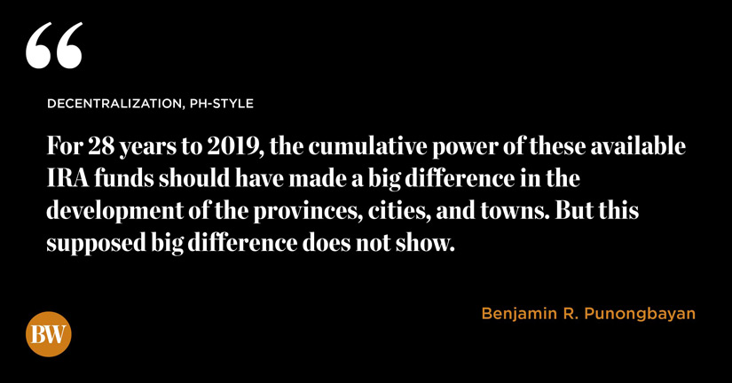 THE Local Government Code of 1991 decentralized local government units (LGUs) and, for this purpose, LGUs were given an annual allocation (allotment) of 40% of national tax collections (Internal Revenue Allotment or IRA). The IRA is in addition to the local taxes that the LGUs already impose and may impose in their respective jurisdictions. Now, after a long 28 years, this decentralization does not seem to have provided the improvements in the lives of our citizens that its proponents had argued as reason for its adoption.