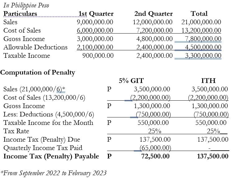 The penalty should be based on 100% or the whole amount of Regular Corporate Income Tax (RCIT) due for the month/s of non-compliance, and not merely based on the excess of the 30% WFH threshold. The corresponding penalty shall be paid using BIR Form No. 0605 and shall be determined by computing the difference between the RCIT and the 5% Gross Income Tax (GIT) or the 5% Special Corporate Income Tax (SCIT).