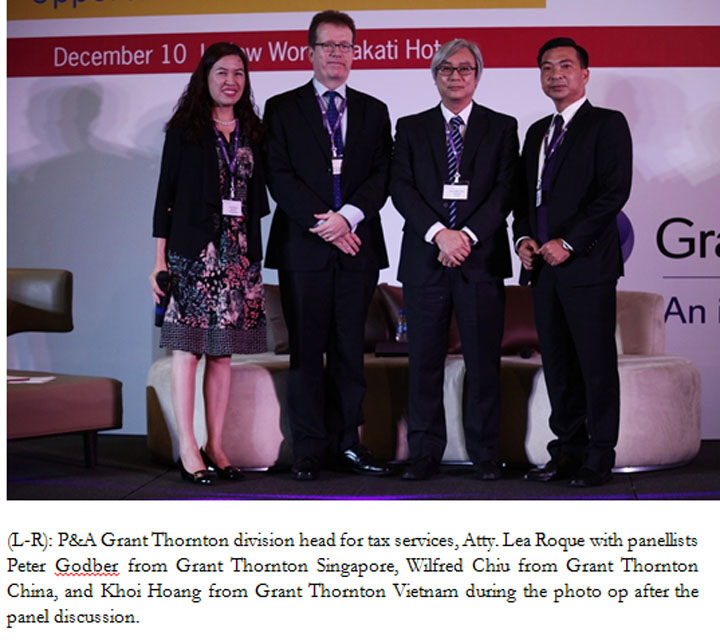 Moderator for the panel discussion was P&A Grant Thornton division head for tax services, Atty. Lea Roque. During the panel discussion, panellists composed of tax leaders Peter Godber of Grant Thornton Singapore, Wilfred Chiu of Grant Thornton China, and Khoi Hoang of Grant Thornton Vietnam discussed how Filipino companies may invest in their respective jurisdictions. They also highlighted various tax incentives that may be available to Filipino investors and various compliance requirements that Filipino investors must take into consideration. All panel members expressed that the adoption of government reforms, including tax administration reforms made in aid of the taxpayer would pave way for Filipino investments to pour in.