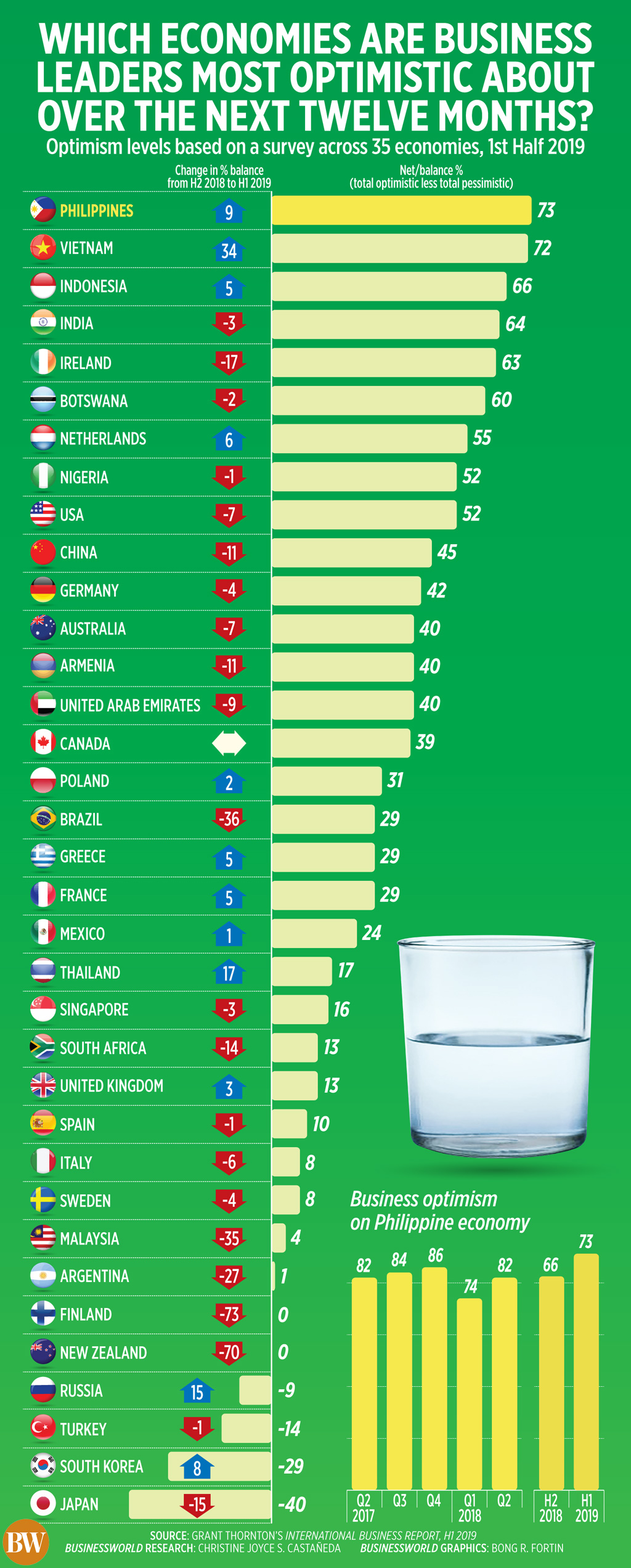 BUSINESSMEN in the Philippines have turned out to be the most bullish globally, according to a press statement released on Tuesday by P&A Grant Thornton that summarized findings of Grant Thornton’s International Business Report (IBR) for the first half, even as net optimism was down one and nine points from 2018’s first and second semesters, respectively.