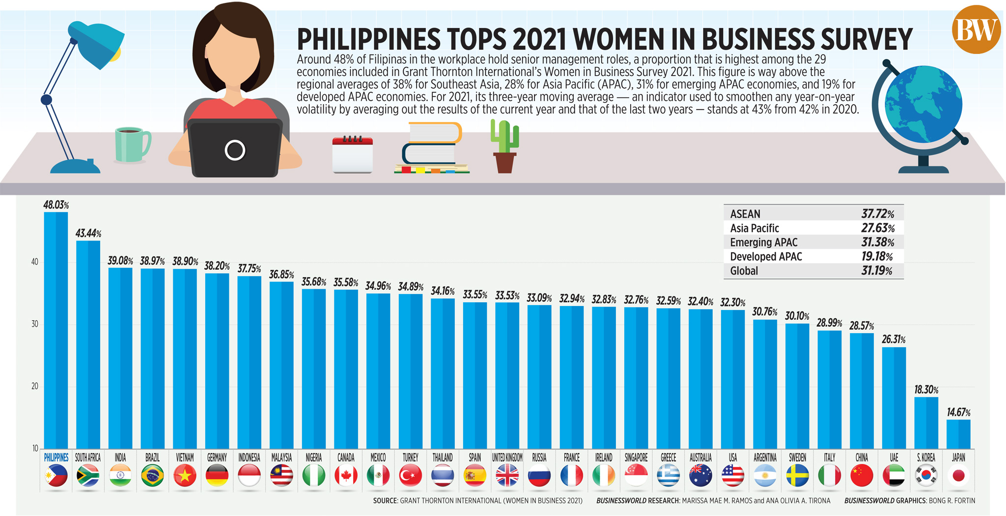 The Grant Thornton International’s 2021 Women in Business Report showed that Filipino women took on 48% of senior leadership roles, up five percentage points from the previous year, when 32 economies were surveyed.
