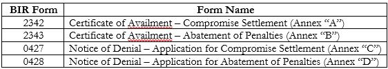 Earlier this year, the Bureau of Internal Revenue (BIR) issued Revenue Memorandum Order (RMO) No. 03-2017 prescribing the format for the Certificate of Availment and Approval and Notice of Denial of the application for compromise settlement and/or abatement of penalties.