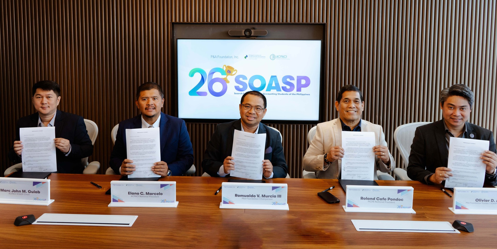Last October 8, the Philippine Institute of Certified Public Accountants (PICPA), Association of Certified Public Accountants in Commerce and Industry (ACPACI), and P&A Foundation Inc., signed a Memorandum of Agreement to commence the 26th Search for the Outstanding Accounting Students of the Philippines (SOASP). The MoA was signed by PICPA National President Roland C. Pondoc, ACPACI National President Elano C. Marcelo, P&A Grant Thornton’s Chairman and Managing Partner and P&A Foundation Chairperson Romualdo V. Murcia III, P&A Foundation Trustee, SOASP Project Coordinator and P&A Grant Thornton’s Vice Chairman and Deputy Managing Partner Atty. Olivier D. Aznar, and ACPACI SOASP Chair Marc John M. Guiab.