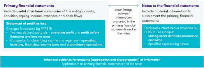 General requirements for the financial statements and information disclosed in the notes have been carried over from PAS 1. There are some limited changes to specific requirements for the statement of cash flows and statement of financial position, however the statement of comprehensive income and statement of changes in equity remain unchanged.