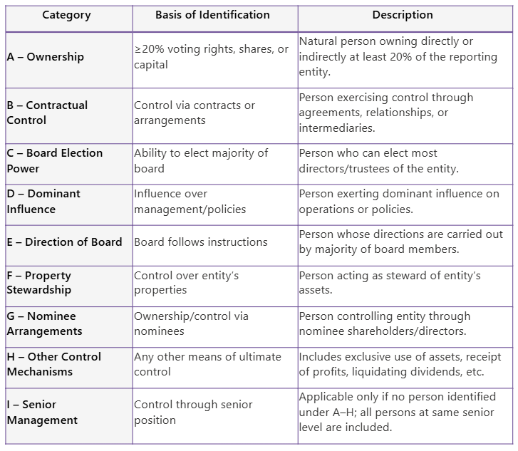 Only natural persons shall be recognized as beneficial owners. All beneficial owners falling under any of the following categories shall be disclosed and all applicable categories shall be reported. An individual shall be considered a beneficial owner from the time they qualify under any of the following categories below: