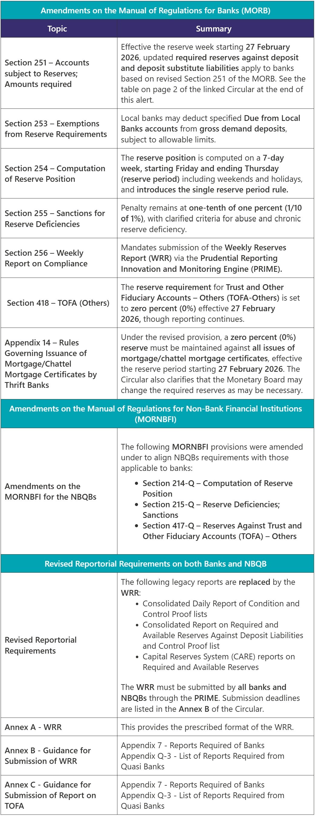 On 22 January 2026, the Monetary Board, through Resolution No. 33, approved amendments to the Manual of Regulations for Banks (MORB) and the Manual of Regulations for Non-Bank Financial Institutions (MORNBFI). These amendments revise the reserve requirements framework, computation rules, and reportorial requirements for banks and non-bank financial institutions with quasi-banking functions.