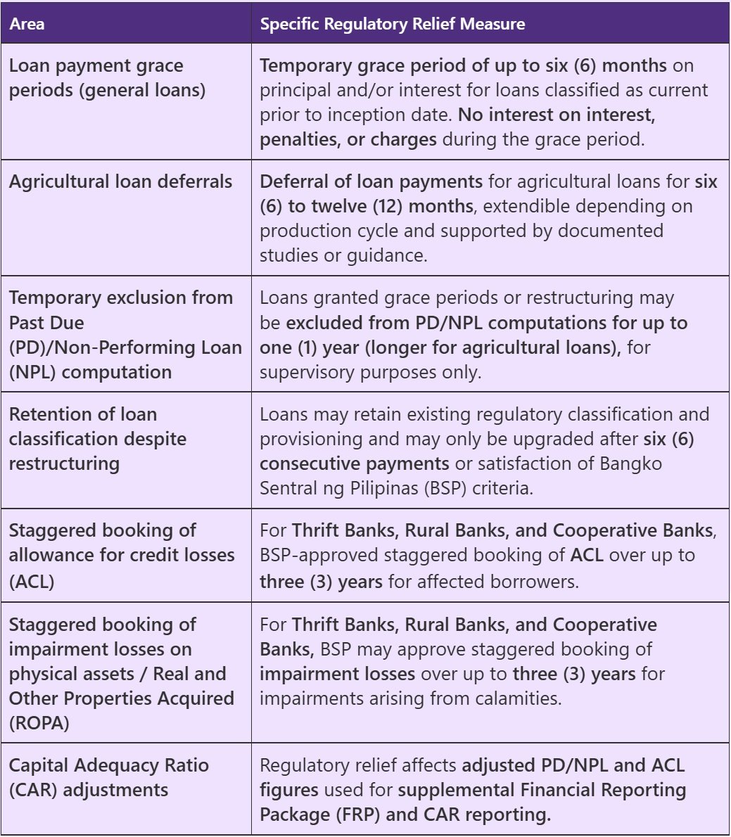 BSP Circular No. 1221 (Series of 2025) also provides operational and supervisory relief measures, as well as additional regulatory relief packages applicable to specific types of banks (e.g., Thrift Banks, Rural Banks, and Cooperative Banks). These include reliefs relating to branch operations, reporting timelines, and other non‑accounting regulatory requirements. BSFIs are encouraged to refer directly to BSP Circular No. 1221 for the complete details of these relief measures.