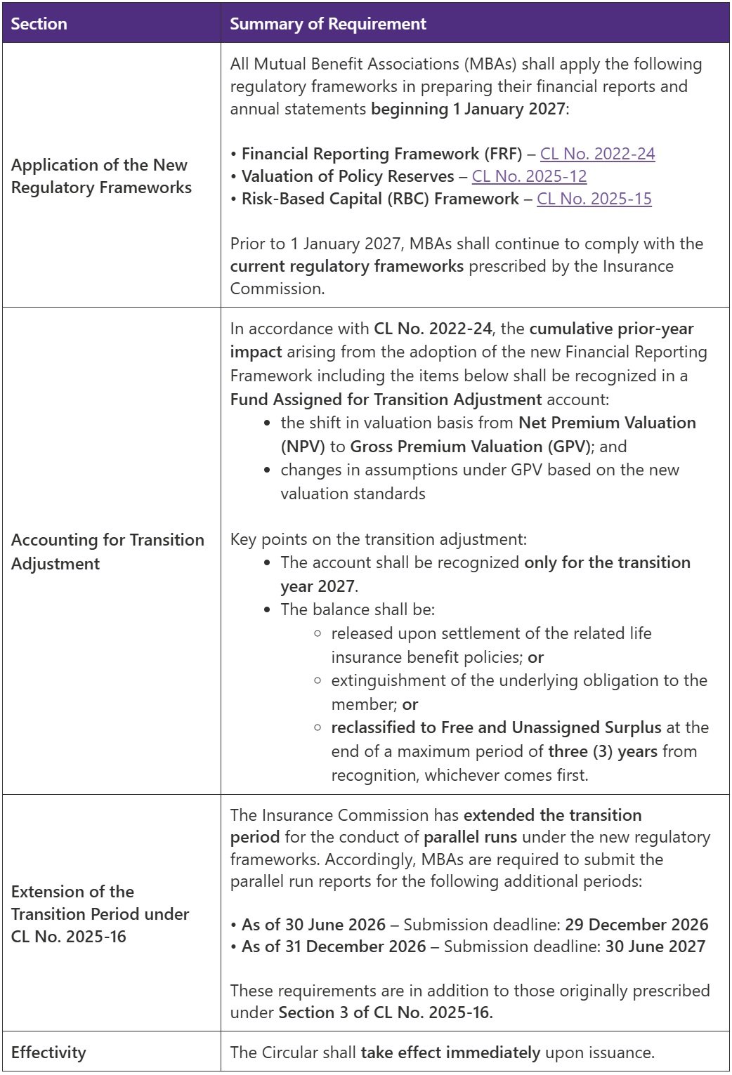 The Insurance Commission (IC) issued Circular Letter (CL) No. 2026‑08 on 25 March 2026, providing supplemental guidelines on the application date, transition accounting, and extended parallel run requirements in relation to the new Financial Reporting Framework (FRF), valuation standards, and Risk‑Based Capital (RBC) framework applicable to Mutual Benefit Associations (MBAs).