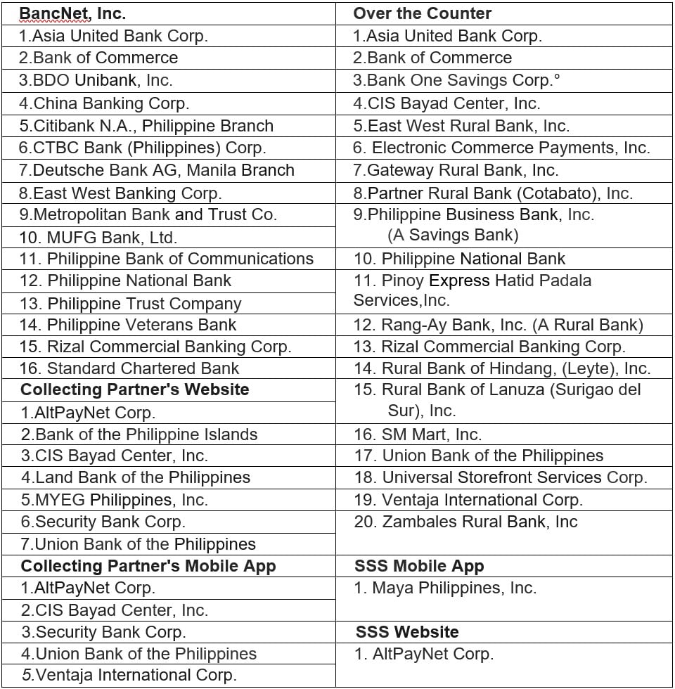 1. The SSS shall only accept payments from SSS-accredited banks and RTCs through the following channels: