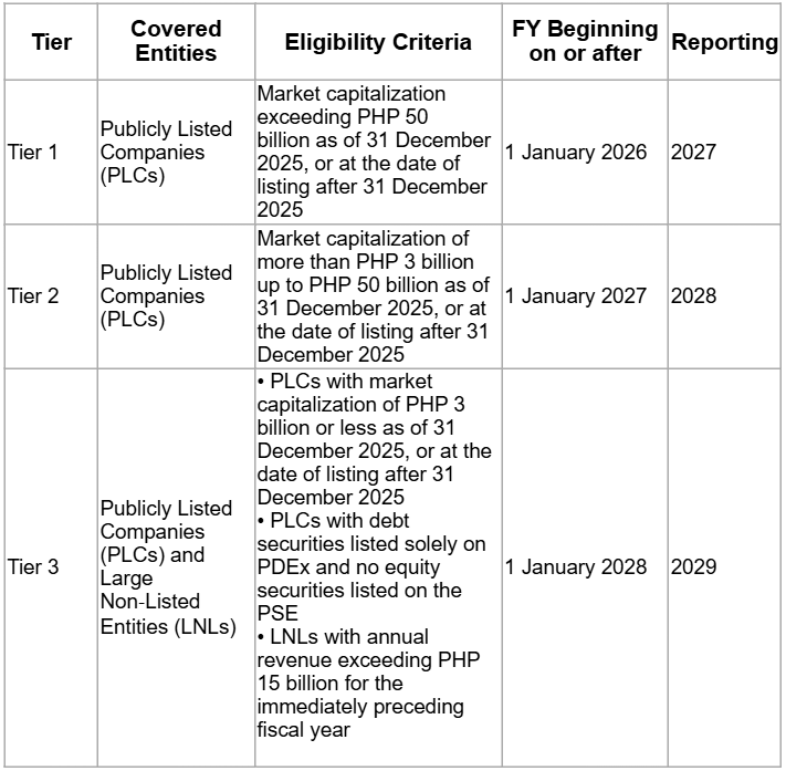 Beginning FY 2026, covered companies shall start adopting PFRS S1 and PFRS S2 with limited extensions of transition standard reliefs, under a tiered approach: