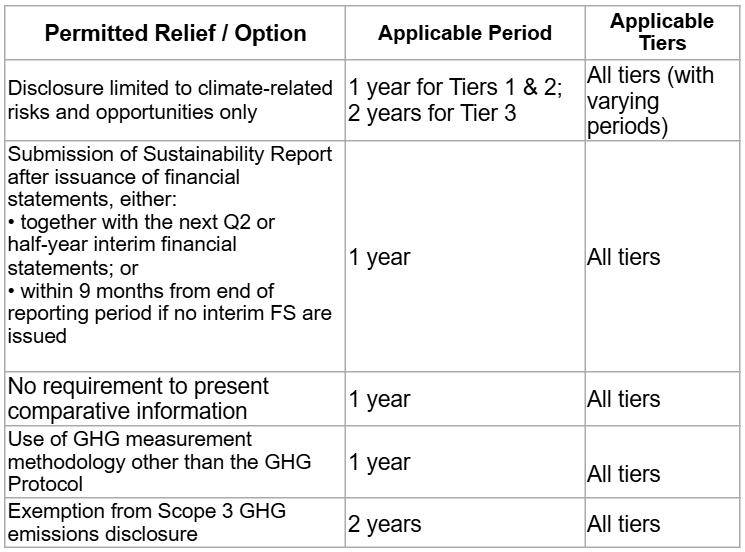 To address implementation challenges identified during public consultations, limited extensions to the transition reliefs provided under the Standards have been granted. No additional reliefs beyond those specified are provided, as companies are permitted to apply reasonable and supportable information available at the reporting date without undue cost or effort for certain disclosure requirements.