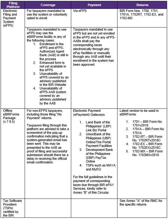 The Bureau of Internal Revenue (“BIR”) reminds all concerned taxpayers of the existing procedures for the electronic filing of tax returns through the following BIR electronic filing platforms: