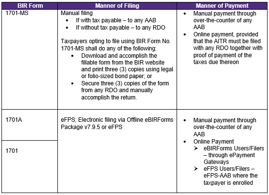 - Medium and large taxpayers are required to electronically file their AITR using BIR Form No. 1701 or 1701A, as applicable.